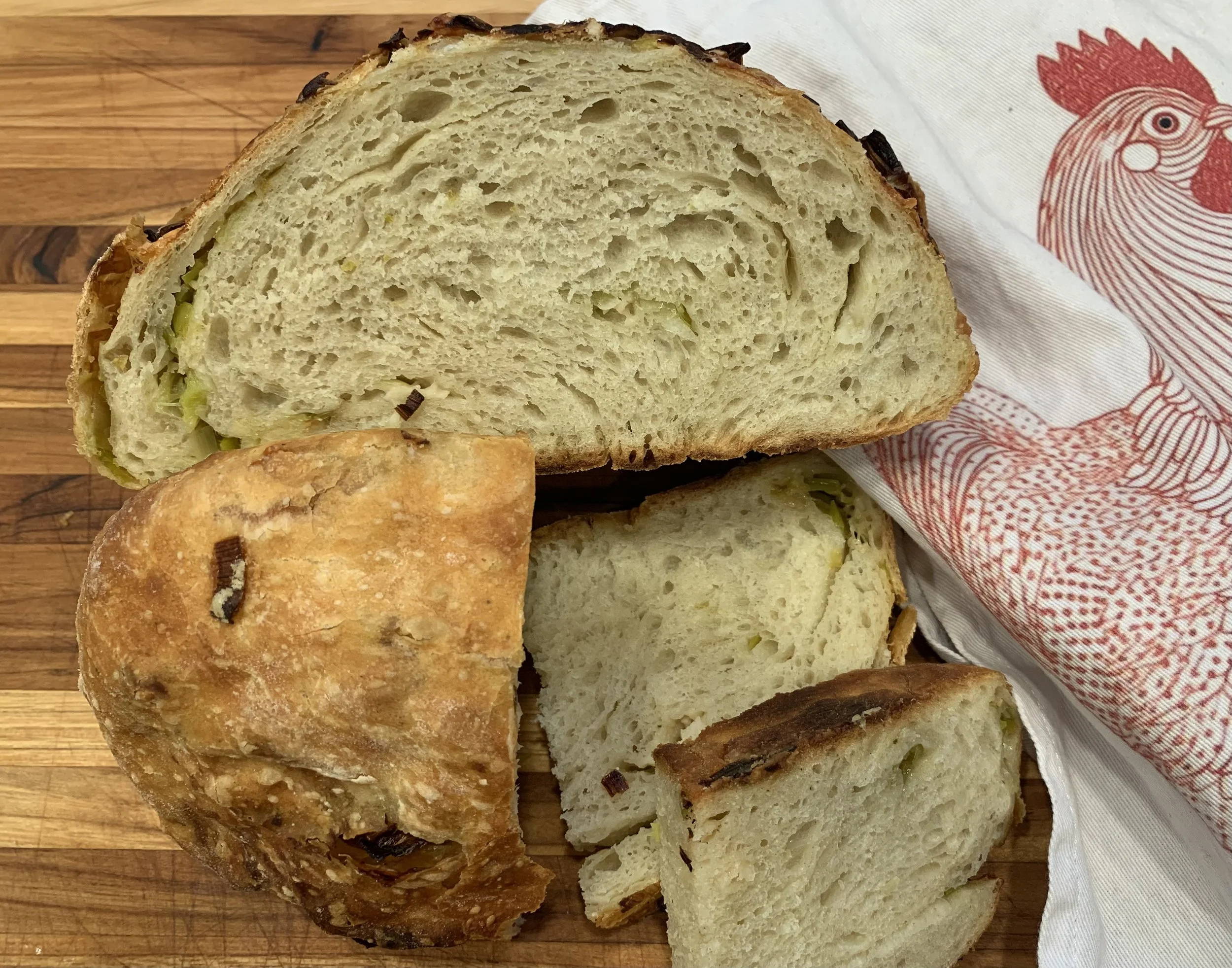 I am pretty passionate about making my own bread. Once you start, it is really hard to eat store bought bread again. My entire family are bread snobs at this point. My husband will say, “ not as good as yours” when we sometimes buy a loaf. But getting started in baking your own bread can seem very daunting. I started with easy ‘no knead’ bread recipes much like this one. That then evolved into sourdough, which is our favorite. But I still like a yeast bread recipe. It is the easiest way to get rolls, bagels, pizza dough, sandwich bread, etc. I am by no means an expert baker so that should show how relaxed bread making really is. It’s not nearly as picky as you will see online. Of course, we will still eat a slightly imperfect loaf so take it with a grain of salt. This recipe was kind of a spontaneous experiment when I had a craving for a really savory bread. It turned out so well, I just needed to share it. It’s quite easy, and I believe adaptable. I still have leeks in my garden, but if you find leeks hard to get right now, I suggest quickly sauted scallions or even just some caramelized onions would be delicious.