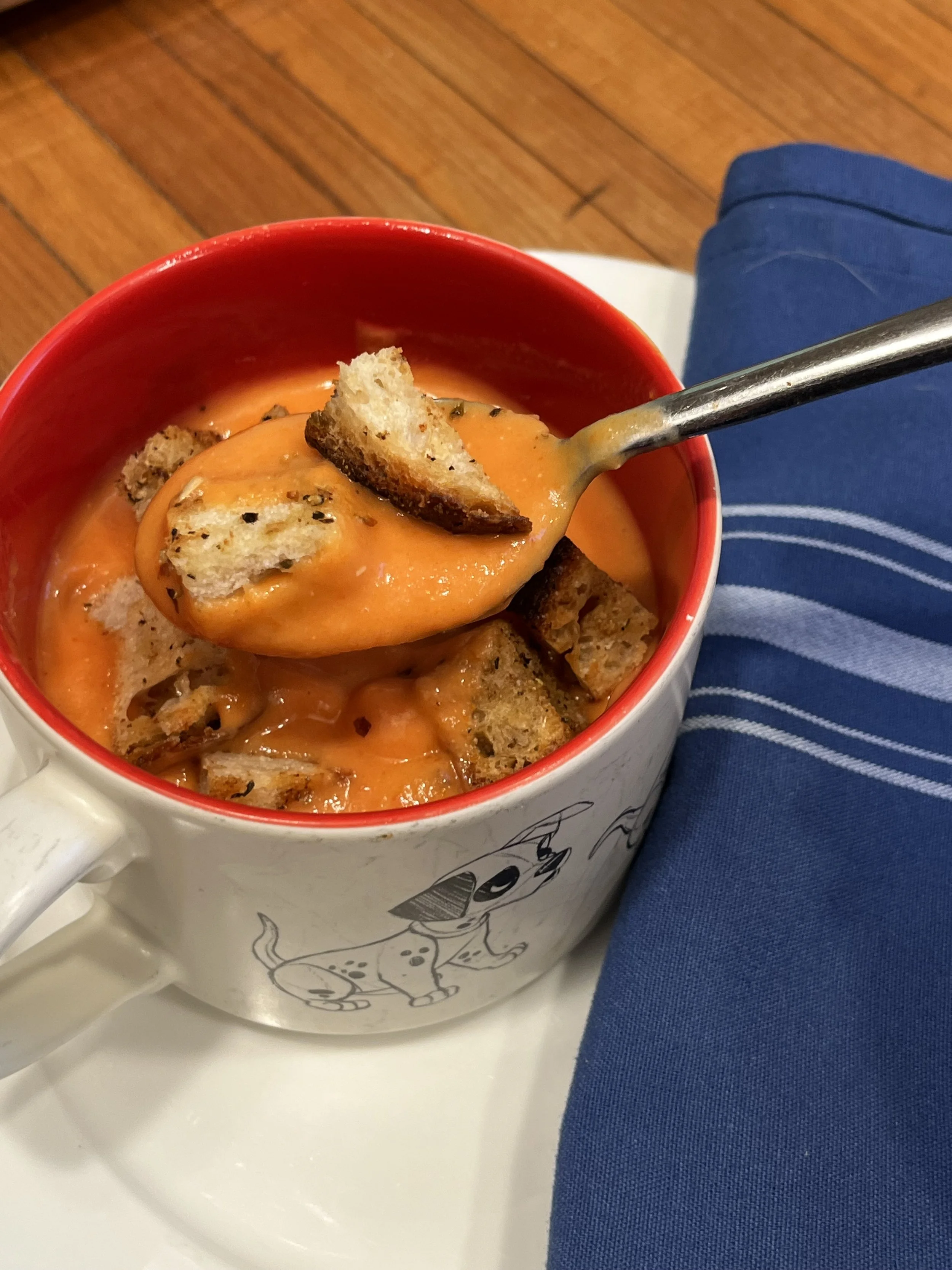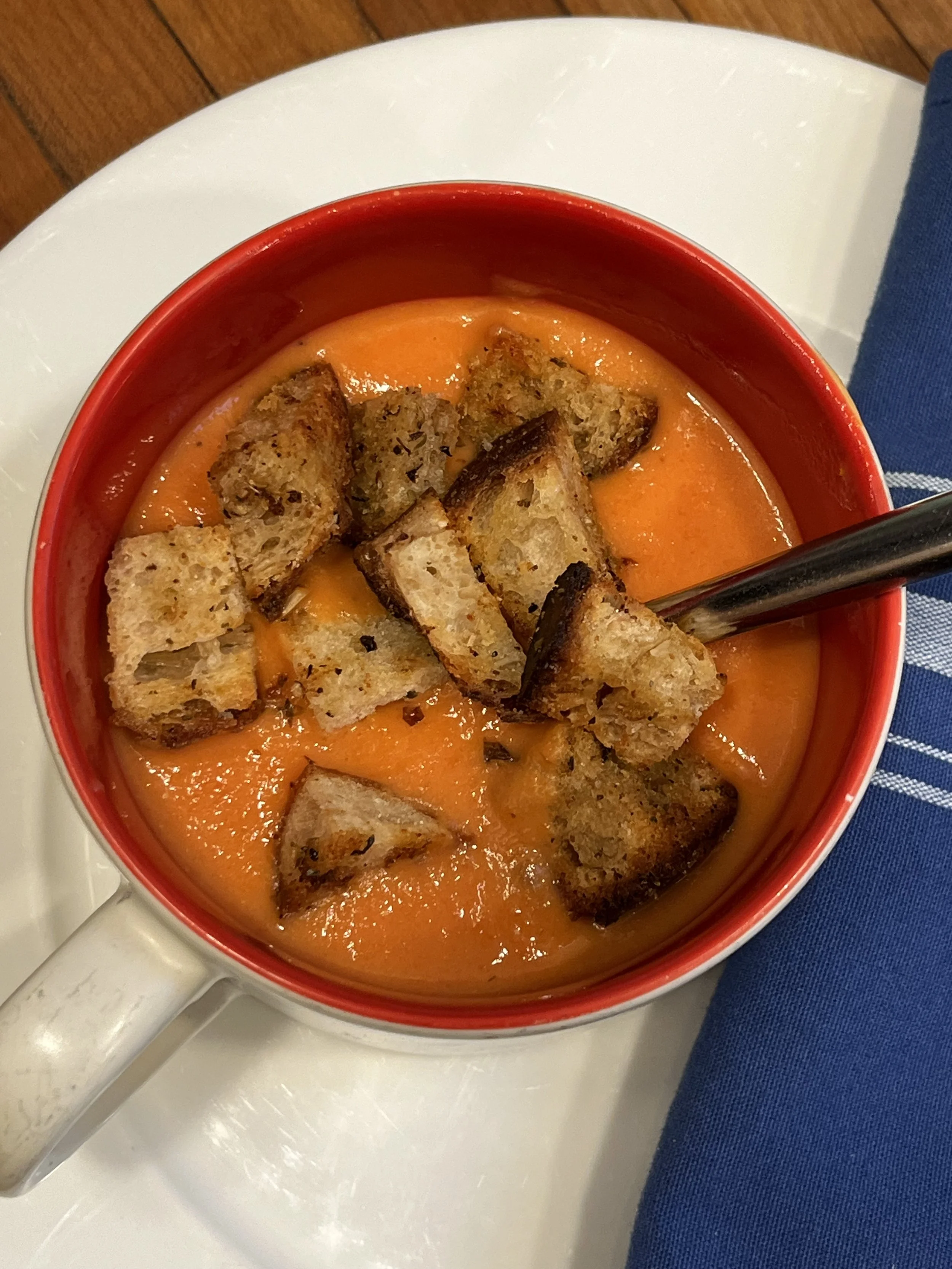 Cream of Roasted Tomato Soup with Sourdough Croutons