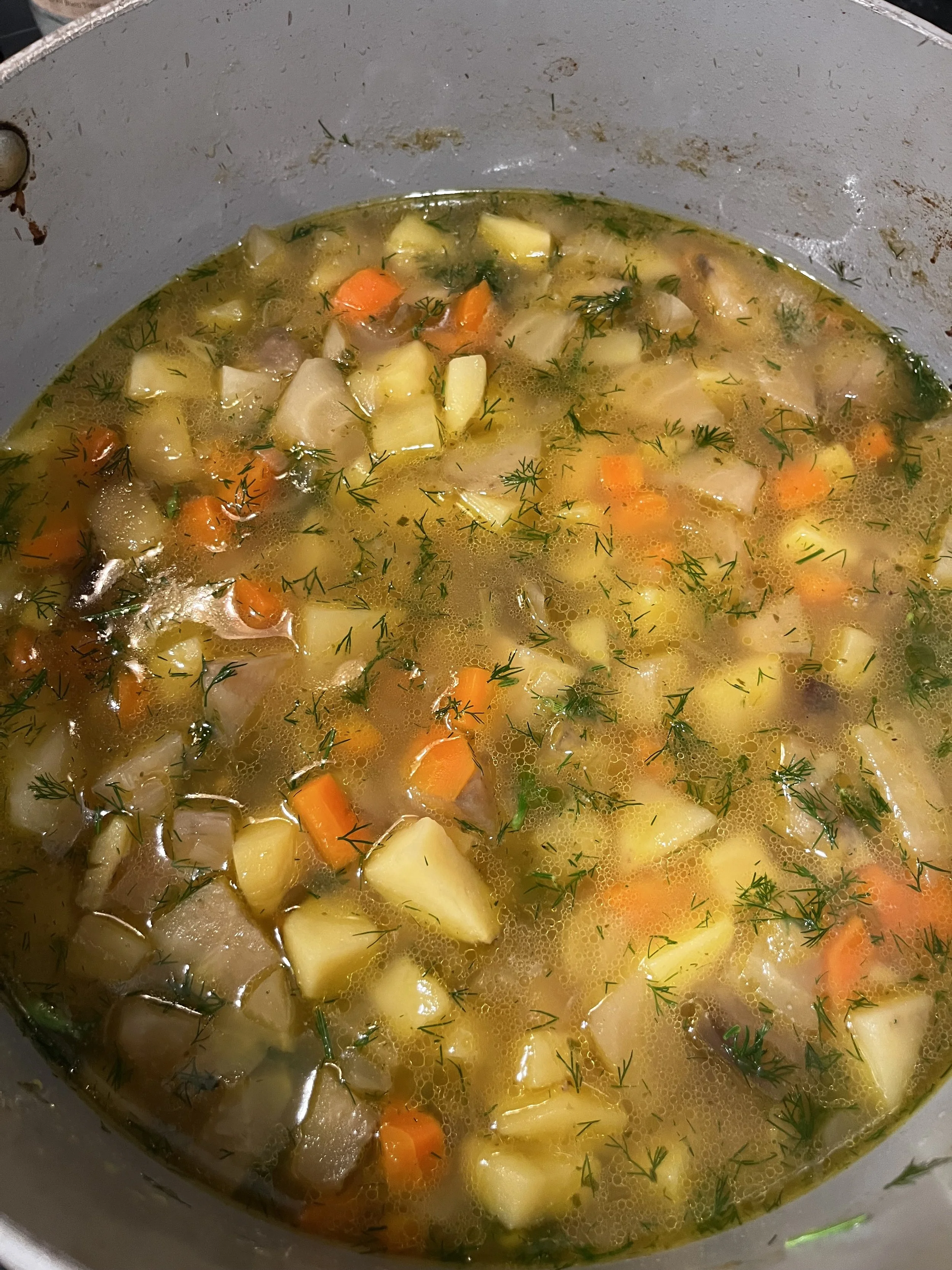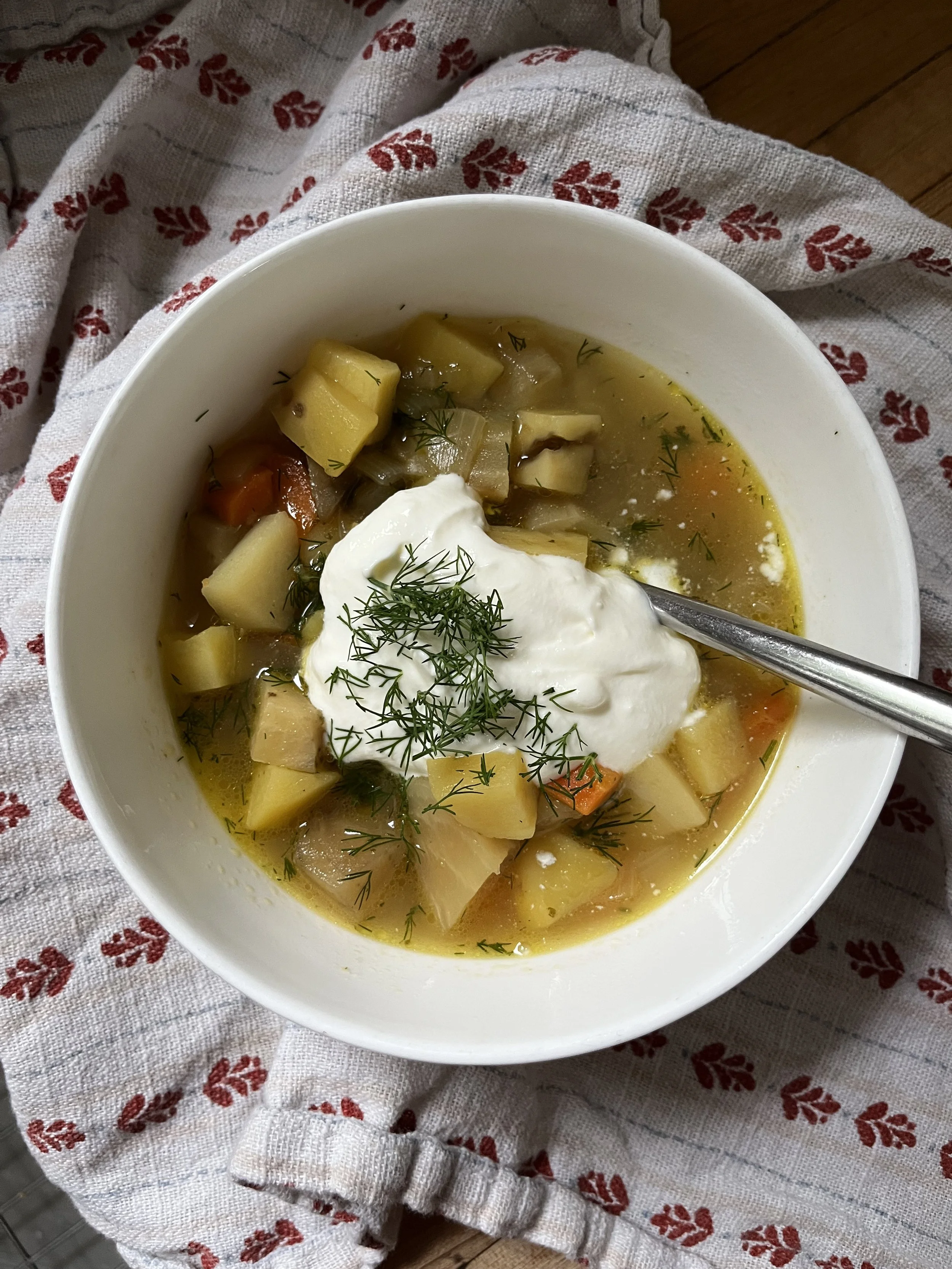 Add the vegetable stock and bring to a low boil. Then reduce heat and simmer for 30 minutes until potatoes and carrots are soft. Then add the chopped dill. Taste for salt and turn off the heat.