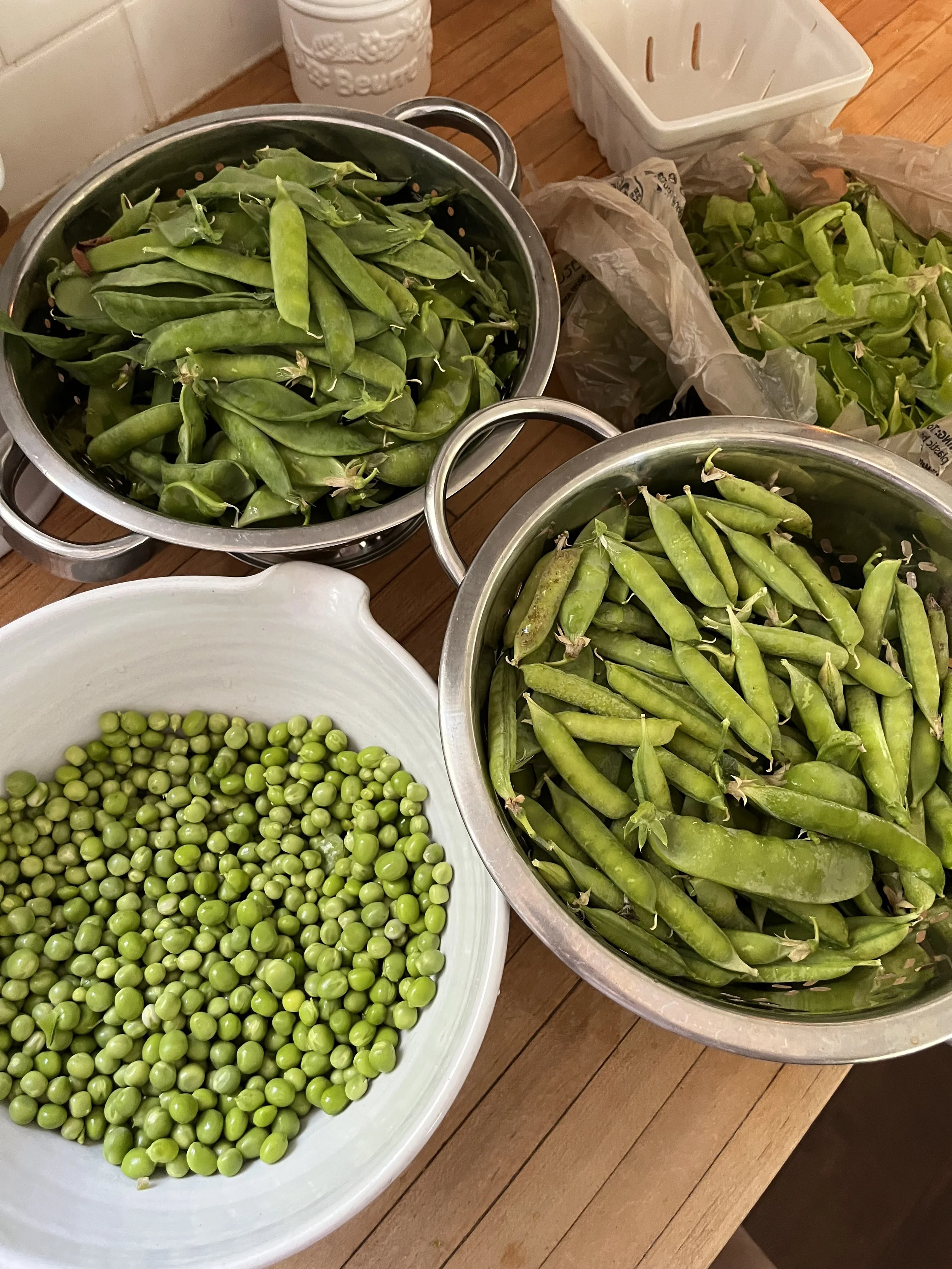 Start by preparing the snap peas. Bring a medium pot of water to boil and salt as if you were going to make pasta. Wash and rinse the peas, then trim off the ends. Drop the pea into the salted boiling water for about 5 minutes then drain and plunge into ice water. I usually just boil the peas, then drain and fill the pot will cold water and ice cubes. This stops the cooking and will preserve some crunch to the peas as well as keeps their bright green color.