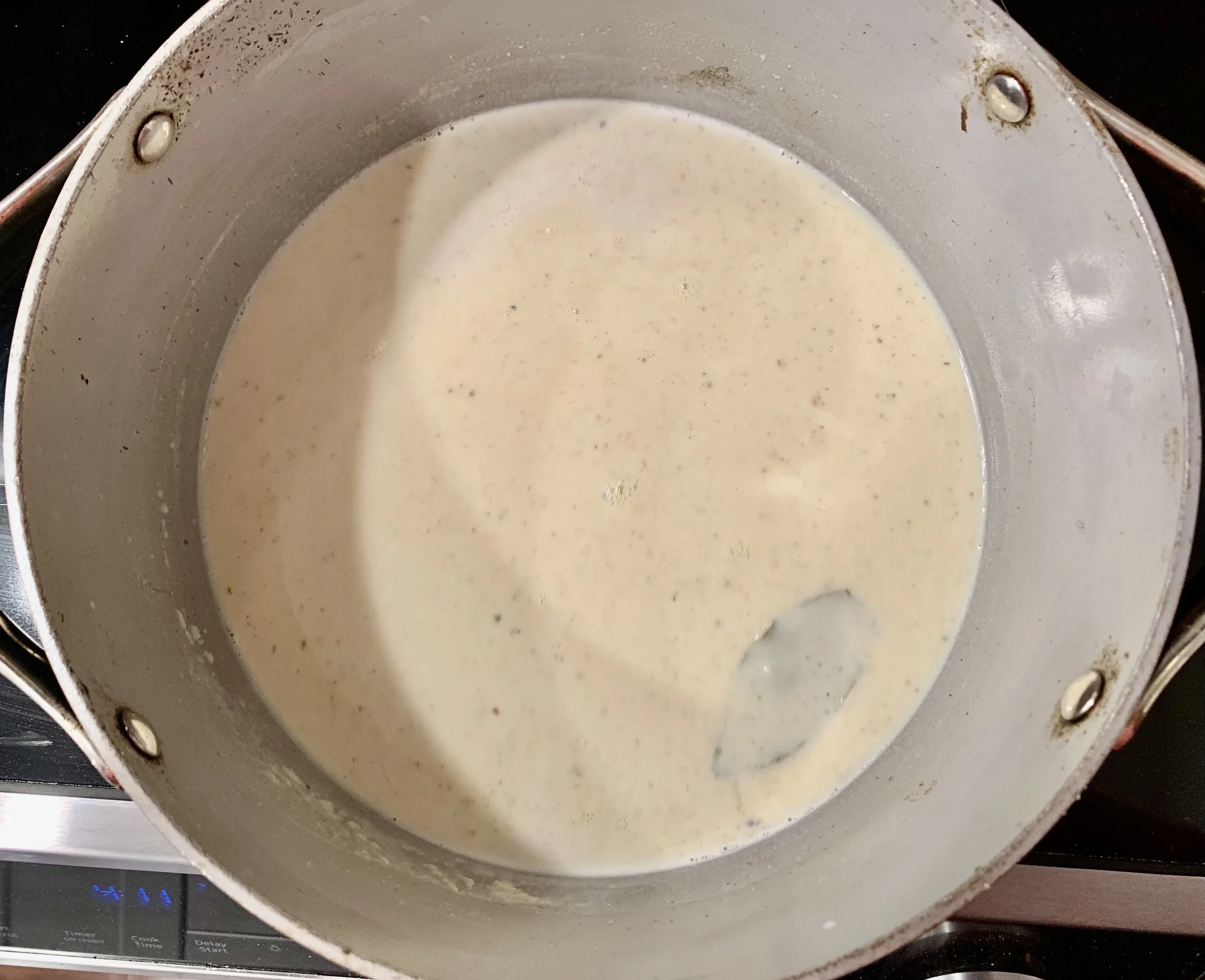 Continue to whisk as the liquid with thicken. Add the miso paste, nutmeg, bay leaf and nutritional yeast. Taste for salt and adjust accordingly.